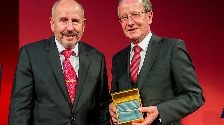 Im Rahmen der Festveranstaltung "Weltfaktor Normung" am 6. November 2014 erhielt Dr. Harald Stallforth den DIN-Ehrenring von DIN-Präsidenten Prof. Dr. Klaus Homann