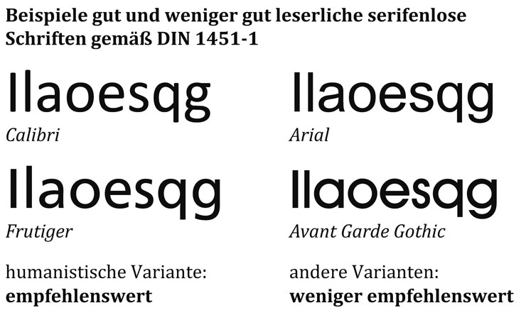 Unter Berücksichtigung ihrer Leserlichkeit gibt die DIN 1451?1 Aufschluss über die heute am Markt verfügbaren digitalen Versionen der DIN-Schriften und empfiehlt darüber hinaus einige gängige Alternativen. Humanistische Varianten weisen zum Beispiel deutlicher unterscheidbarere (I, l, a, q, g) und offenere Buchstabenformen (a, e, s) auf als andere serifenlose Schriften.