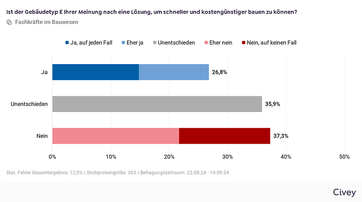 Welchen Einfluss haben Normen auf die Effizienz und die Kosten beim Wohnungsbau? Gemeinsam mit Civey hat DIN rund 300 Fachleuten aus dem Bauwesen u. a. zum Gebäudetyp E befragt.
