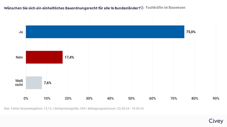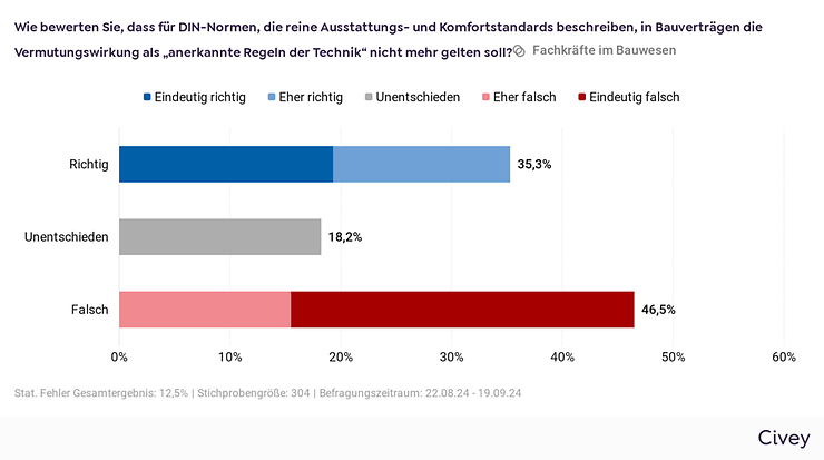 Das Meinungsforschungsinstitut Civey hat für DIN vom 22.08.2024 bis 19.09.2024 rund 300 aktive Fach- und Führungskräfte aus der Bauwirtschaft online befragt, die DIN-Normen in ihrer täglichen Arbeit nutzen. Die Ergebnisse sind aufgrund von Quotierungen und Gewichtungen repräsentativ unter Berücksichtigung des statistischen Fehlers von rund 13 Prozentpunkten. Weitere Informationen zur Methodik von Civey