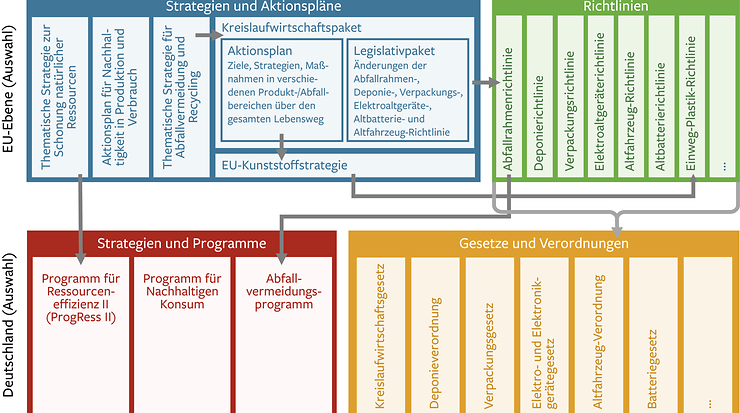 Noch funktionieren Kreislaufsysteme bestenfalls als Insellösungen oder Vorzeigeprojekte. Damit sich dies ändert, müssen alle Beteiligten den Markt auf Basis einheitlicher Standards und gesetzlicher Vorgaben regeln. Politische Entscheidungen zur Circular Economy werden häufig auf europäischer Ebene getroffen, aber national umgesetzt und mit Leben gefüllt. Auch auf nationaler Ebene wurden verschiedene Strategien entwickelt, die z. T. auf den europäischen Aktionsplänen basieren.