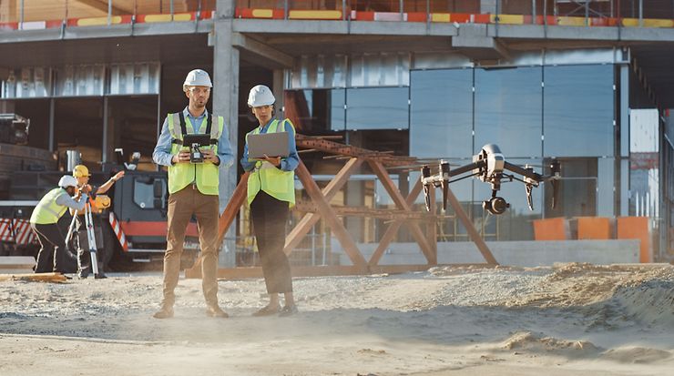 Bauchfachleute arbeiten mit einer Drohne auf der Baustelle
