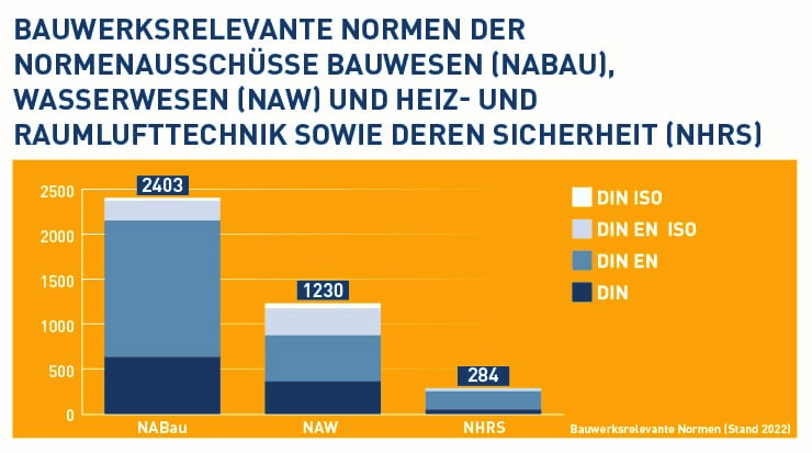 Die folgende Grafik zeigt die bauwerksrelevanten Normen (Stand 2022) der beteiligten nationalen Normenausschüsse NABau, NAW und NHRS nach deren Herkunft.