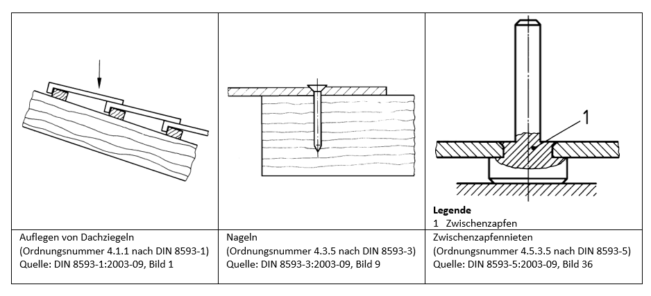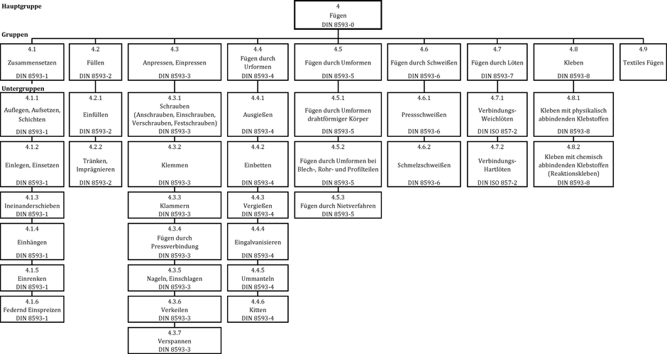 In den einzelnen Normen der Reihe DIN 8593 erfolgt dann eine weitergehende Aufteilung zum Teil bis in die fünfte Ebene. Insgesamt sind Begriffsbestimmungen für fast 100 einzelne Fertigungsverfahren der Hauptgruppe 4 „Fügen“ definiert (siehe Bild 3 für Beispiele).