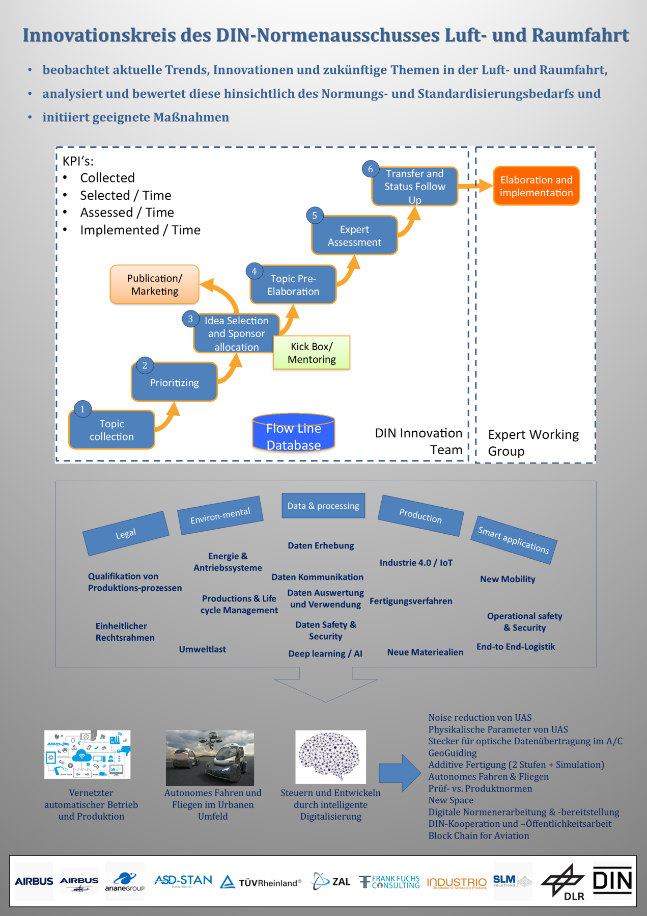 Auf der ILA Berlin 2018 konnten u. a. erste Normungsarbeiten für die Themen Geräuschemission von UAS, autonomes Fahren und Fliegen sowie GeoGuiding (Verkehrsführung von UAS) eingeleitet werden. Weitere Themen sind New Space, elektrisches Fliegen und die Additive Fertigung.