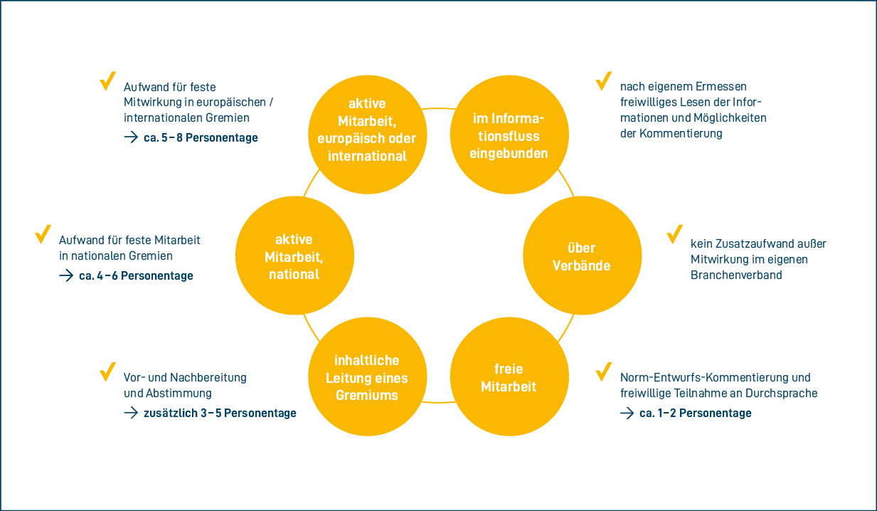 Mitmachen lohnt sich also! Der Aufwand für Ihr Unternehmen ist überschaubar: Schon mit fünf bis acht Personentagen sind Sie in nationalen und internationalen Gremien vertreten.